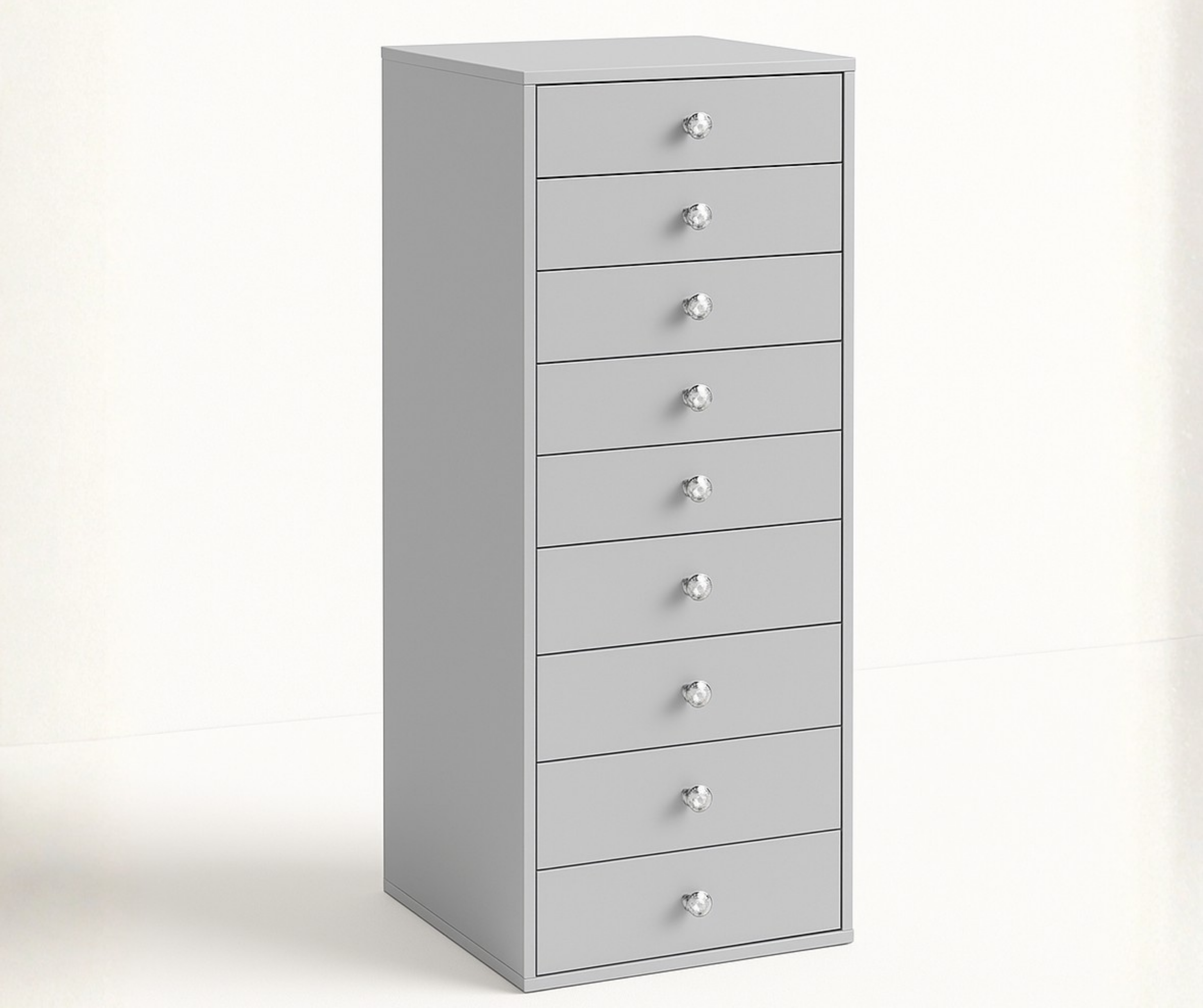 Built with nine smooth-gliding drawers, this tall storage tower is perfect for organizing makeup, skincare, hair tools, perfumes, brushes, jewelry, nail products, craft supplies, and everyday essentials. Each drawer features stunning Crystal Lux knobs, giving your vanity a clean, elegant, luxury touch.