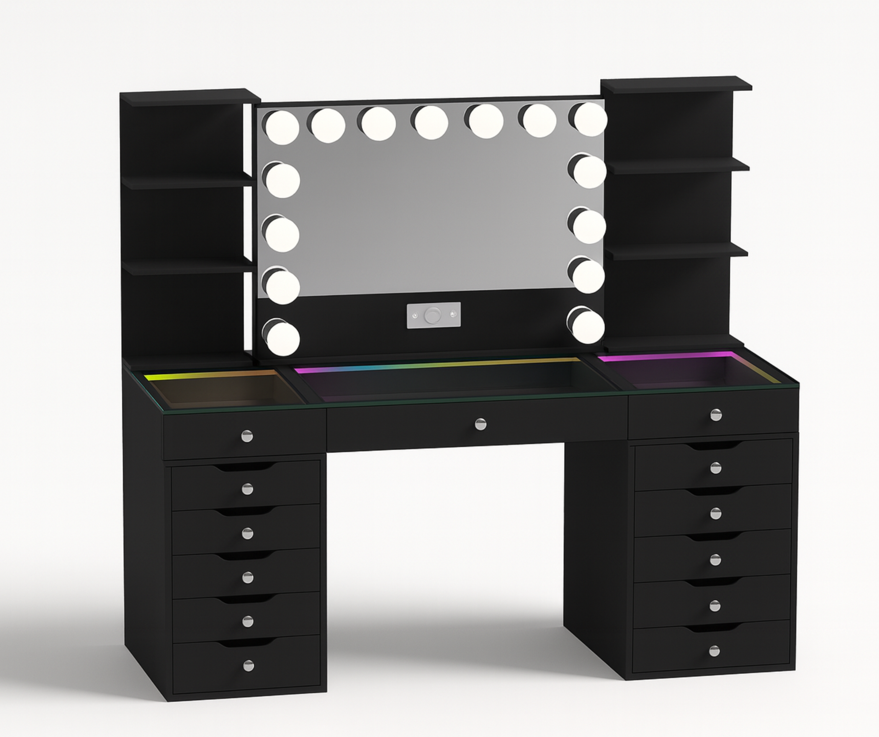The spacious Eva Pro Desk includes an impressive 13 full-size drawers, giving you maximum organized storage for makeup, skincare, hair tools, jewelry, and accessories. The premium RGB LED light strip built inside the tabletop creates a beautiful illuminated display area under durable tempered glass—perfect for showcasing your favourite products.
