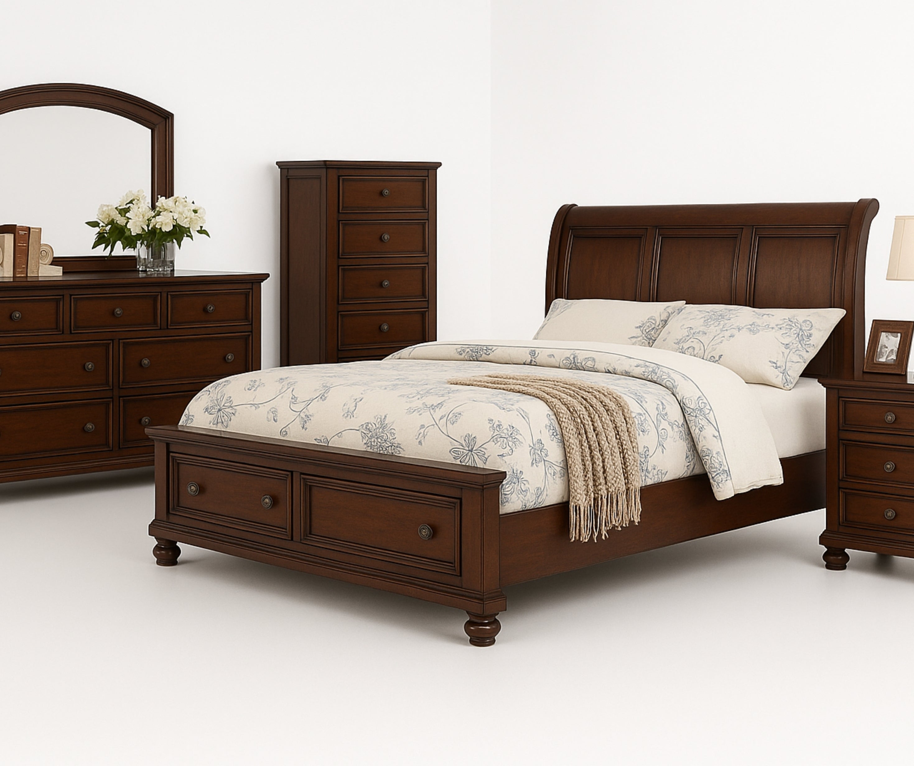The Kasey Bedroom Set showcases the warmth and character of solid wood in a rich dark walnut finish. With a coordinated bed, dresser, mirror, chest, and nightstand, this set offers a complete, cohesive look for your primary bedroom while delivering excellent durability and storage.