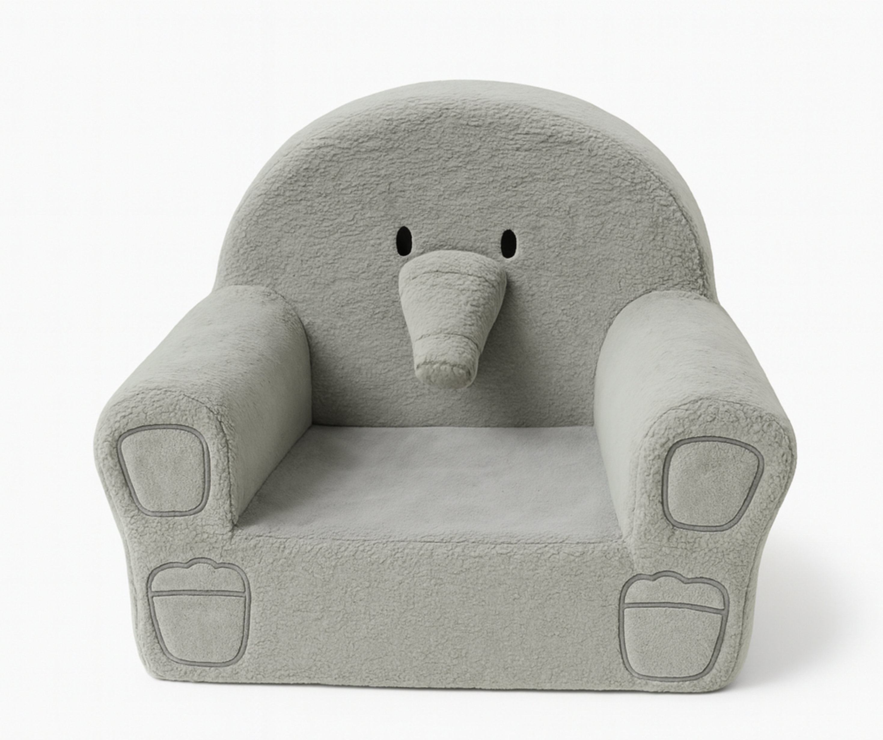 Adorable elephant-themed design with 3D trunk Soft grey plush fabric for a cozy feel Frameless foam build—lightweight, safe, kid-friendly Comfortable cushioning ideal for reading and play Cute ear and paw-print detailing Perfect for nurseries, playrooms, bedrooms, and daycares