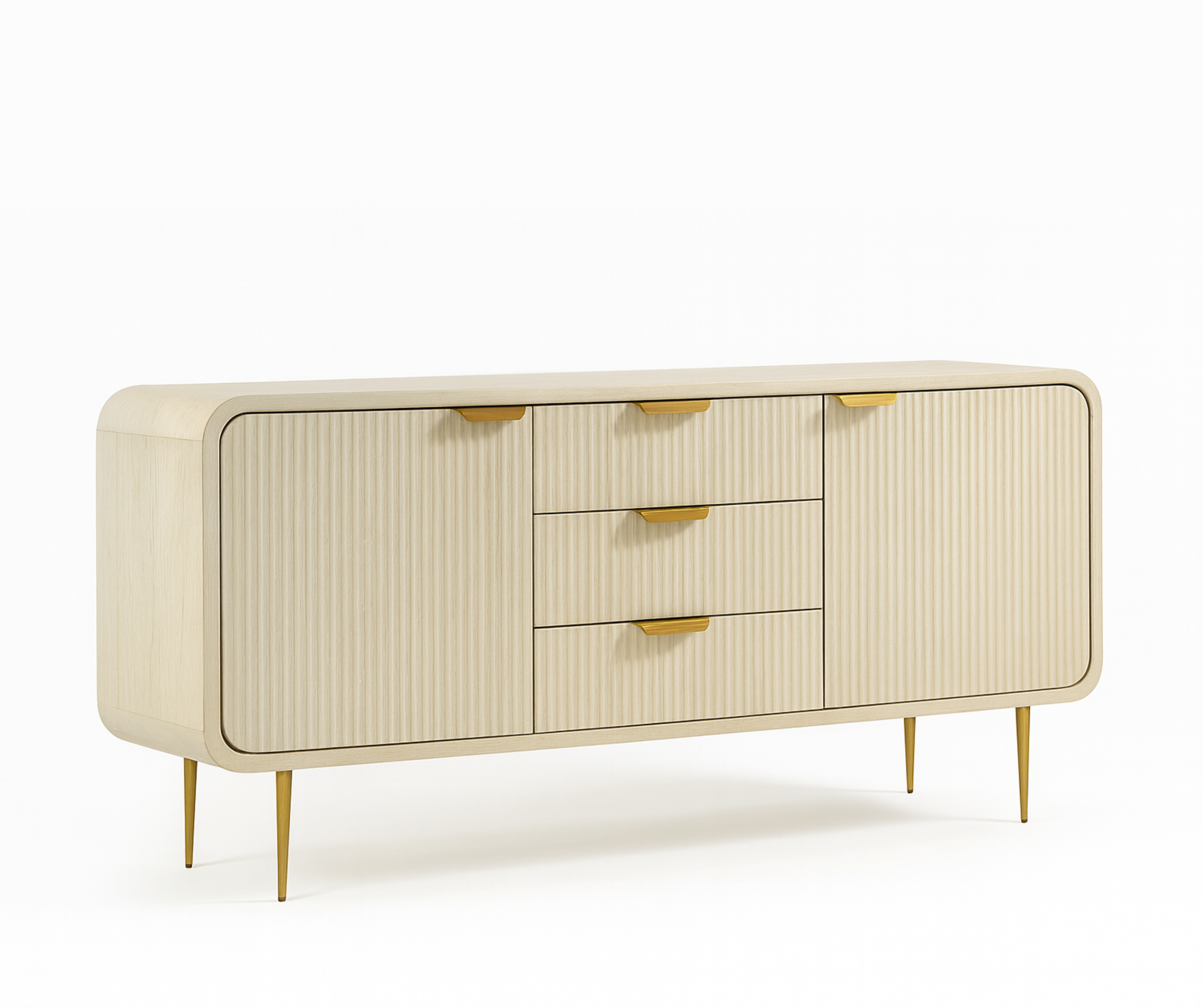Made from solid mango wood for durability and longevity Elegant white finish that highlights natural grain patterns Brushed gold handles for a sophisticated, modern touch Three storage drawers + two enclosed cabinets Slim, elevated legs for an airy, modern silhouette Perfect for living rooms, dining rooms, entryways, or offices