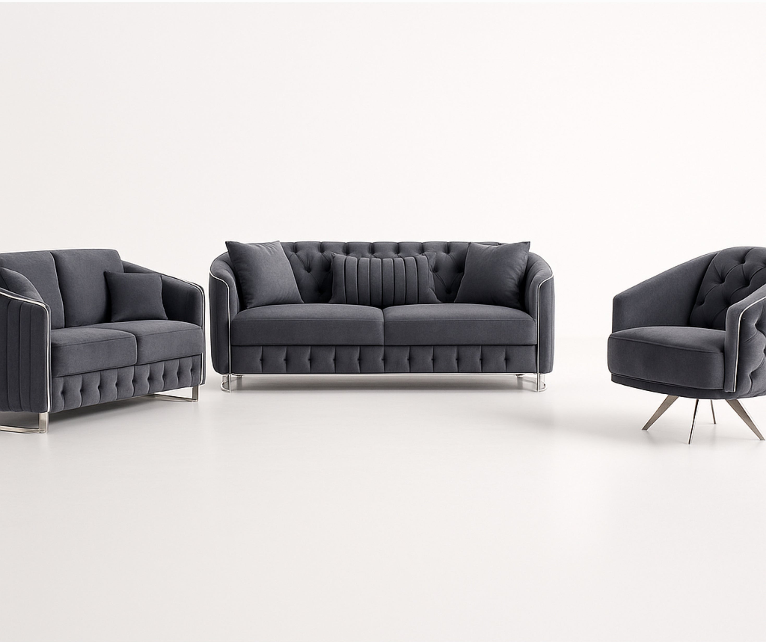 The Rosa Turkish Sofa Set adds a touch of European‑inspired luxury to your living room. Upholstered in soft velvet with a stylish black and grey palette, this 3‑piece set delivers both comfort and elegance.