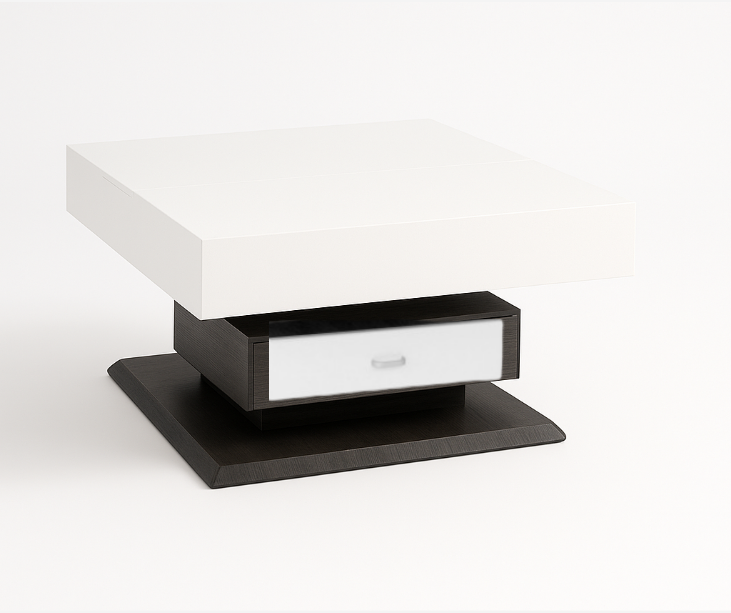 Contemporary clean-line design 360-degree rotating top for flexible positioning Lift-top surface ideal for working or dining Hidden inner storage compartment Additional lower storage drawer High-gloss white top with modern grey base Perfect for condos, living rooms, lounges, and modern interiors